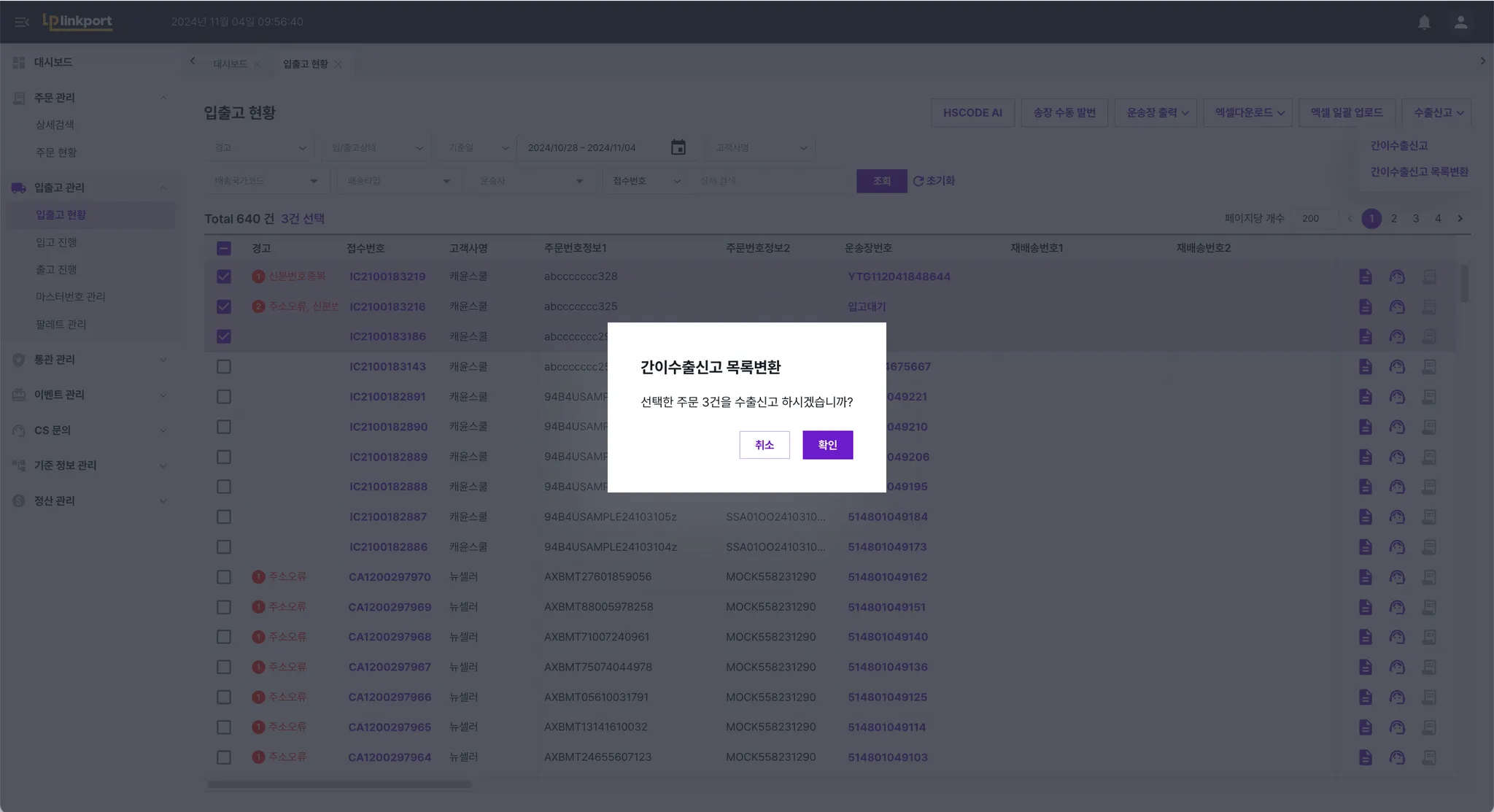 Agente의 간이수출신고, 간이수출신고 목록변환을 주문 단위로 진행할 수 있습니다.