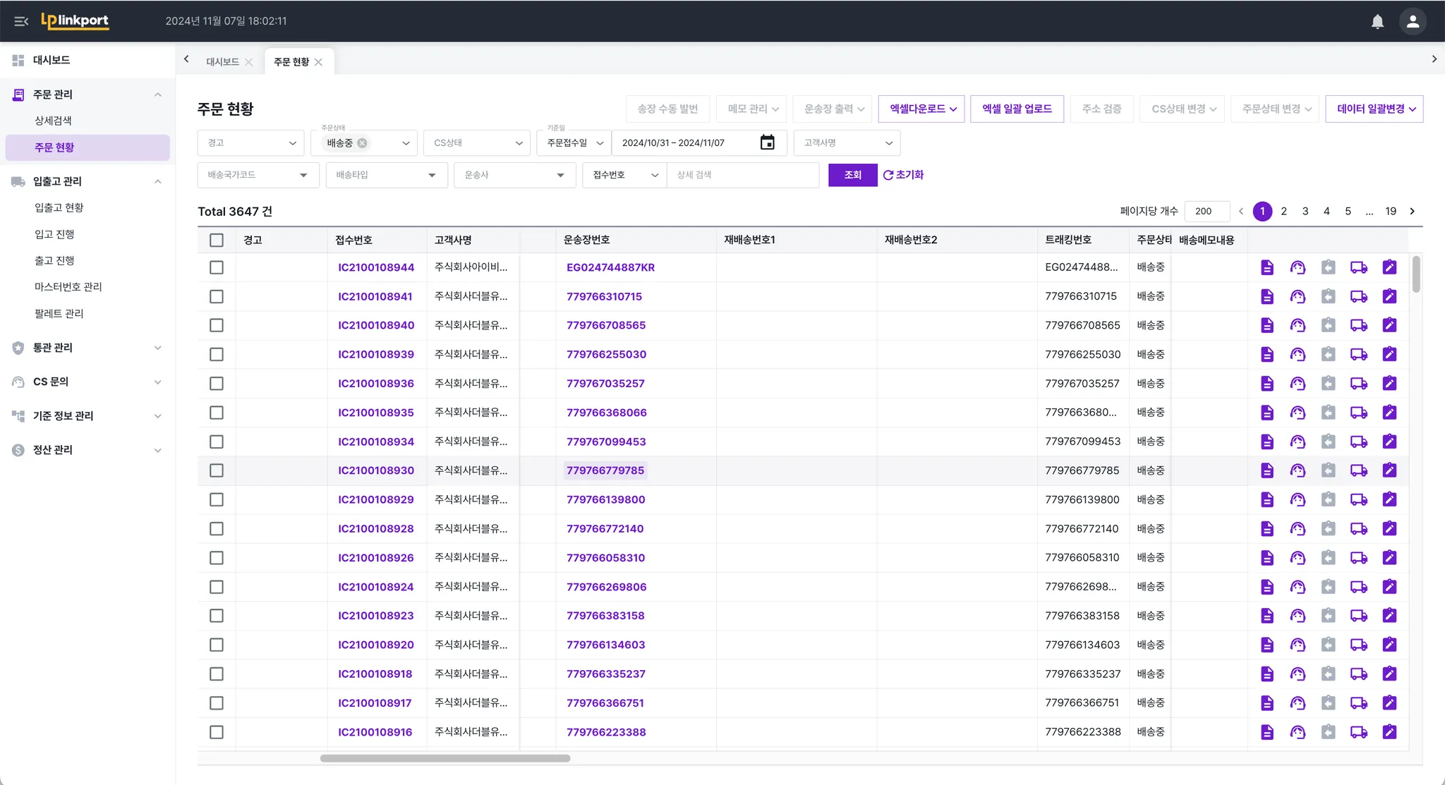 접수번호 주문번호1 운송장번호 로 조회가 가능합니다.