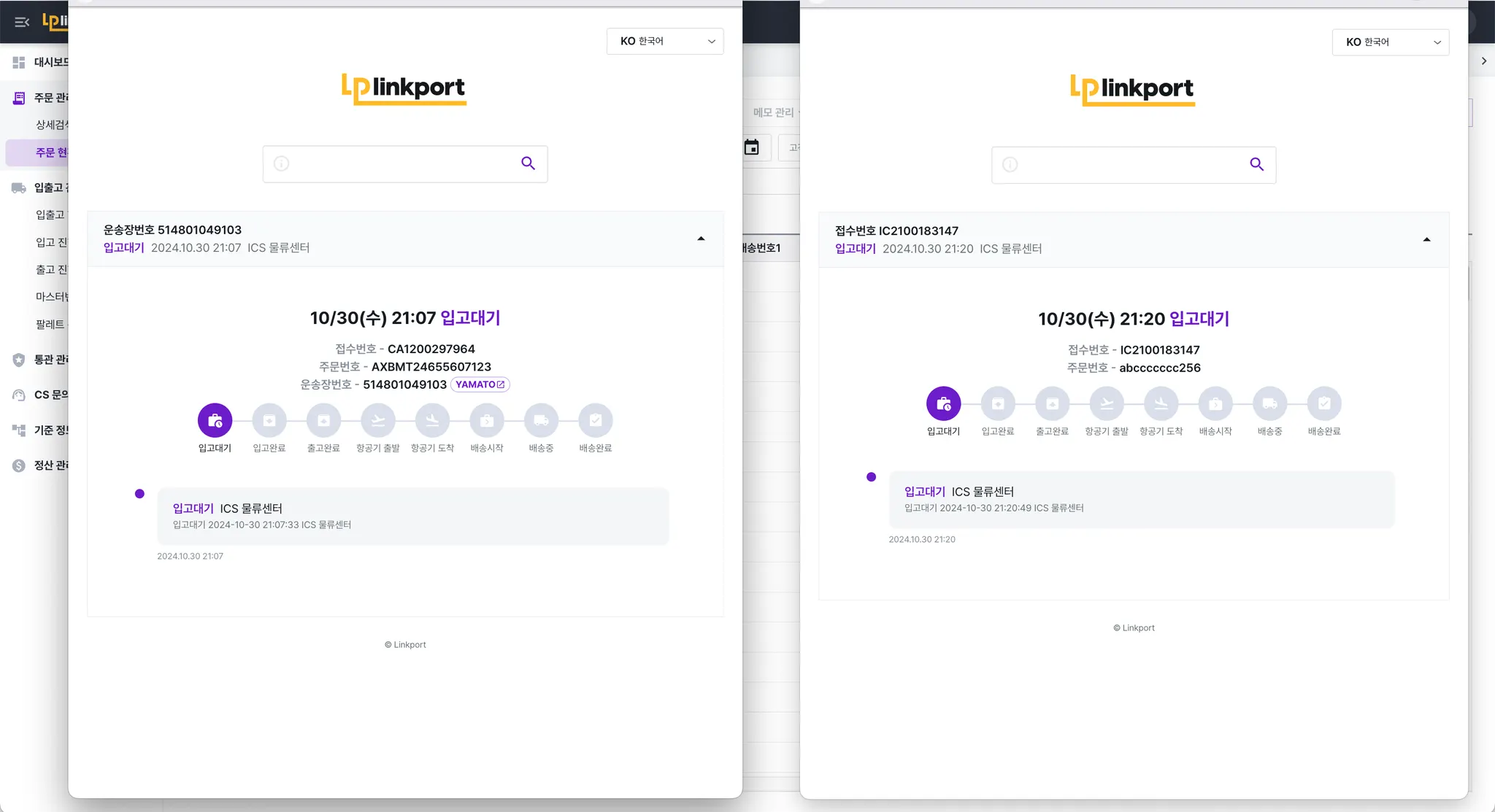 좌 : 운송장번호가 있는 입고대기 상태 주문 , 우 : 운송장번호가 아직 없는 입고대기 상태 주문