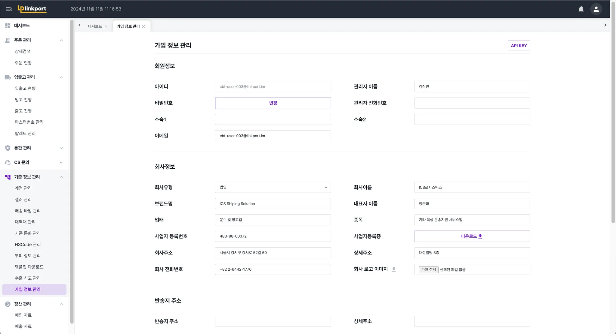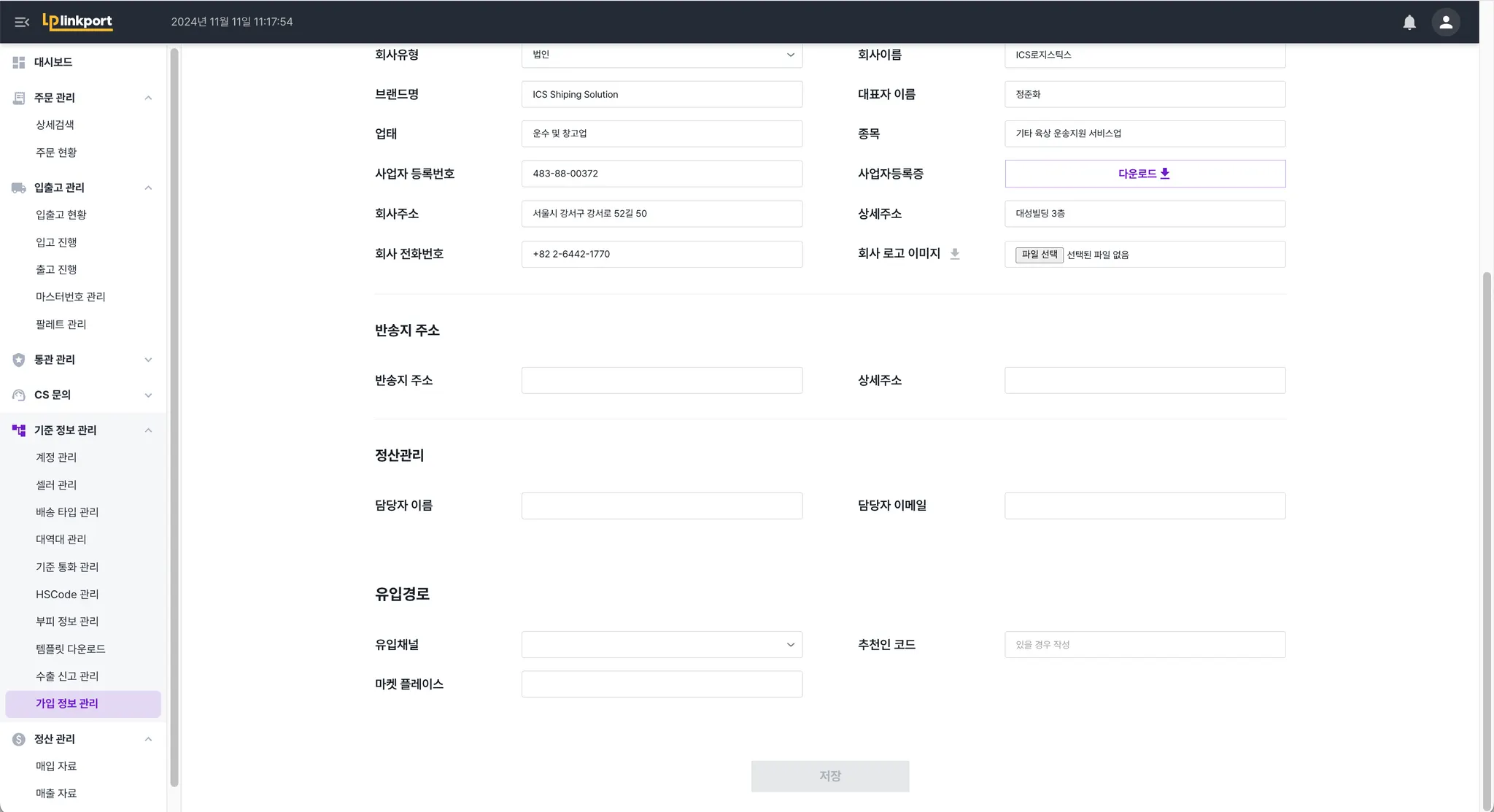 Admin 계정은 기본으로 ICS의 회사정보가 입력되어있습니다.