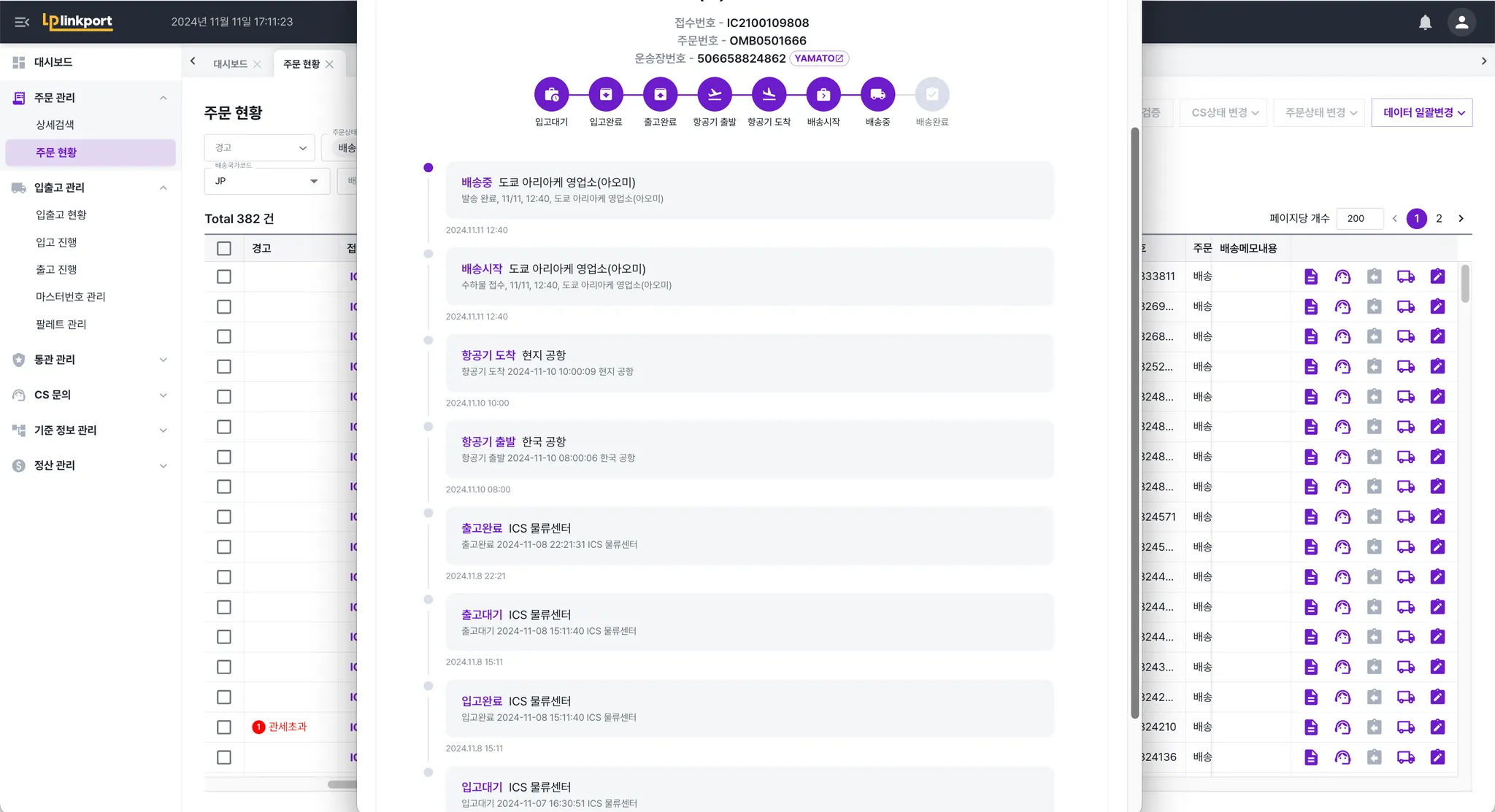 ICS물류센터에서 출고 완료된 이후 일본 현지 야마토 배송사에 도착해서 배송이 시작되기 전까지 트래킹 내용은 마스터의 항공기 출도착 시간으로 입력해야 합니다.
