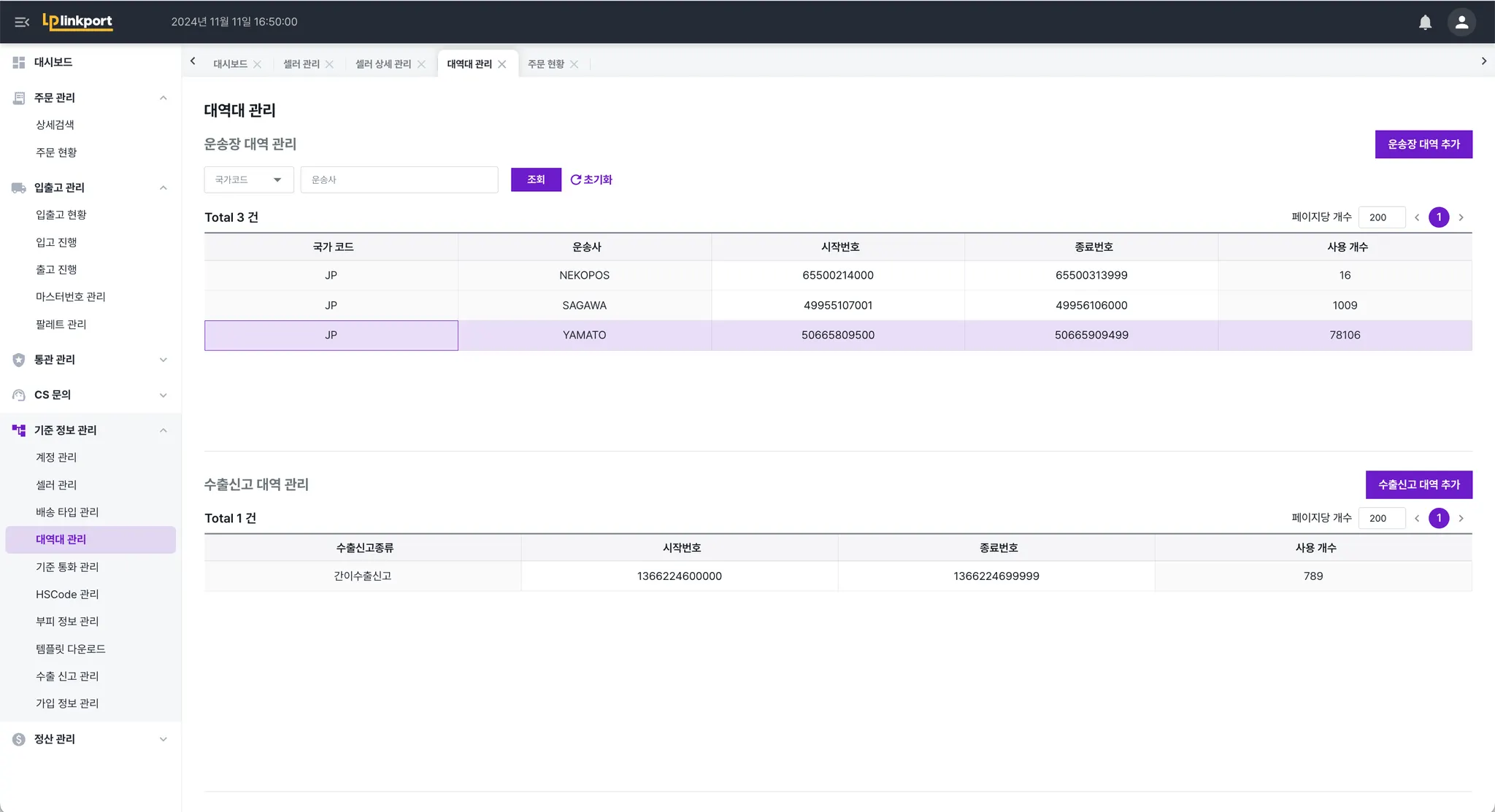 야마토는 셀러가 배송요청 (어드민의 입고대기) 시점에 대역대의 운송장번호가 발번됩니다.