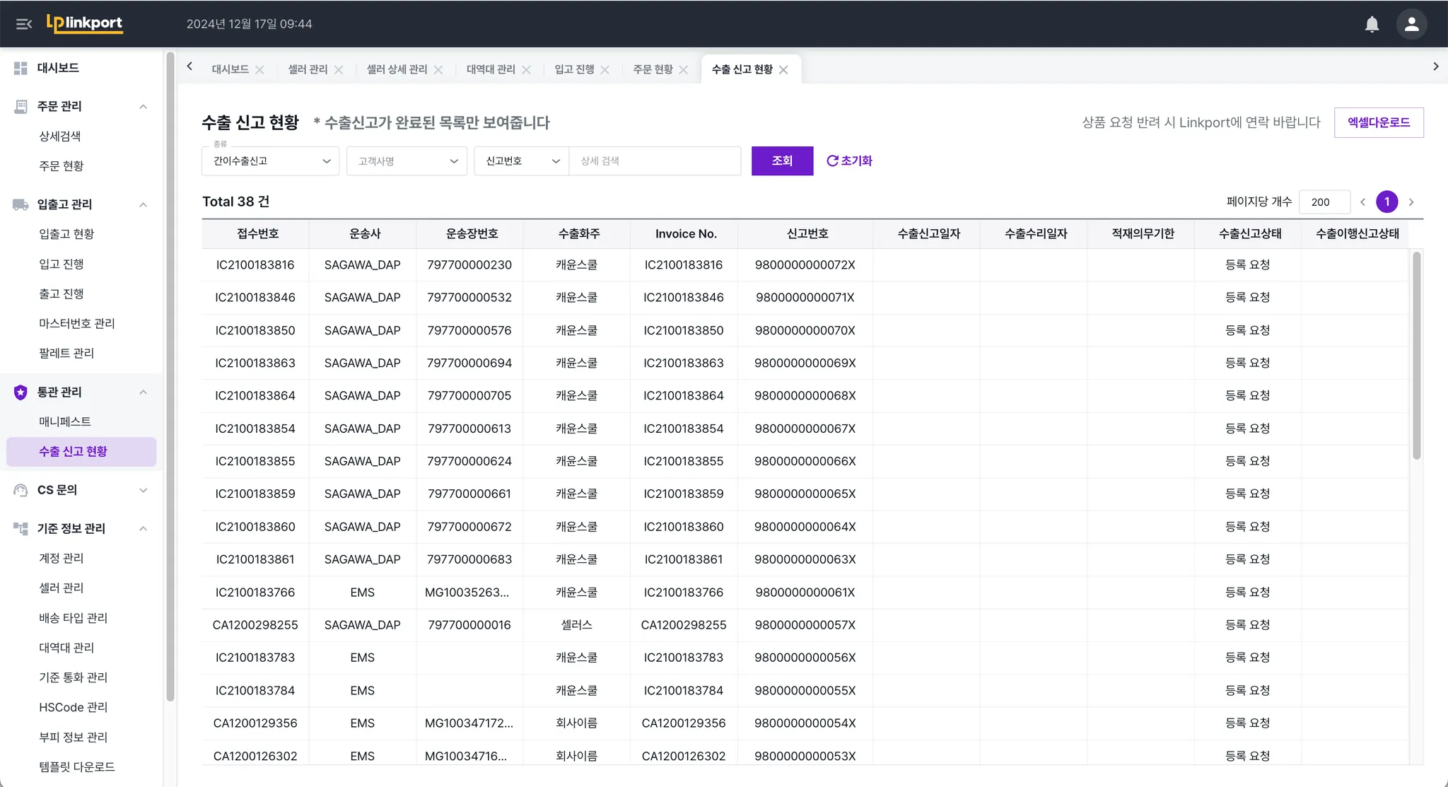 통관관리 - 수출 신고 현황에서 입고진행한 주문이 등록 요청 상태임을 확인할 수 있습니다.
