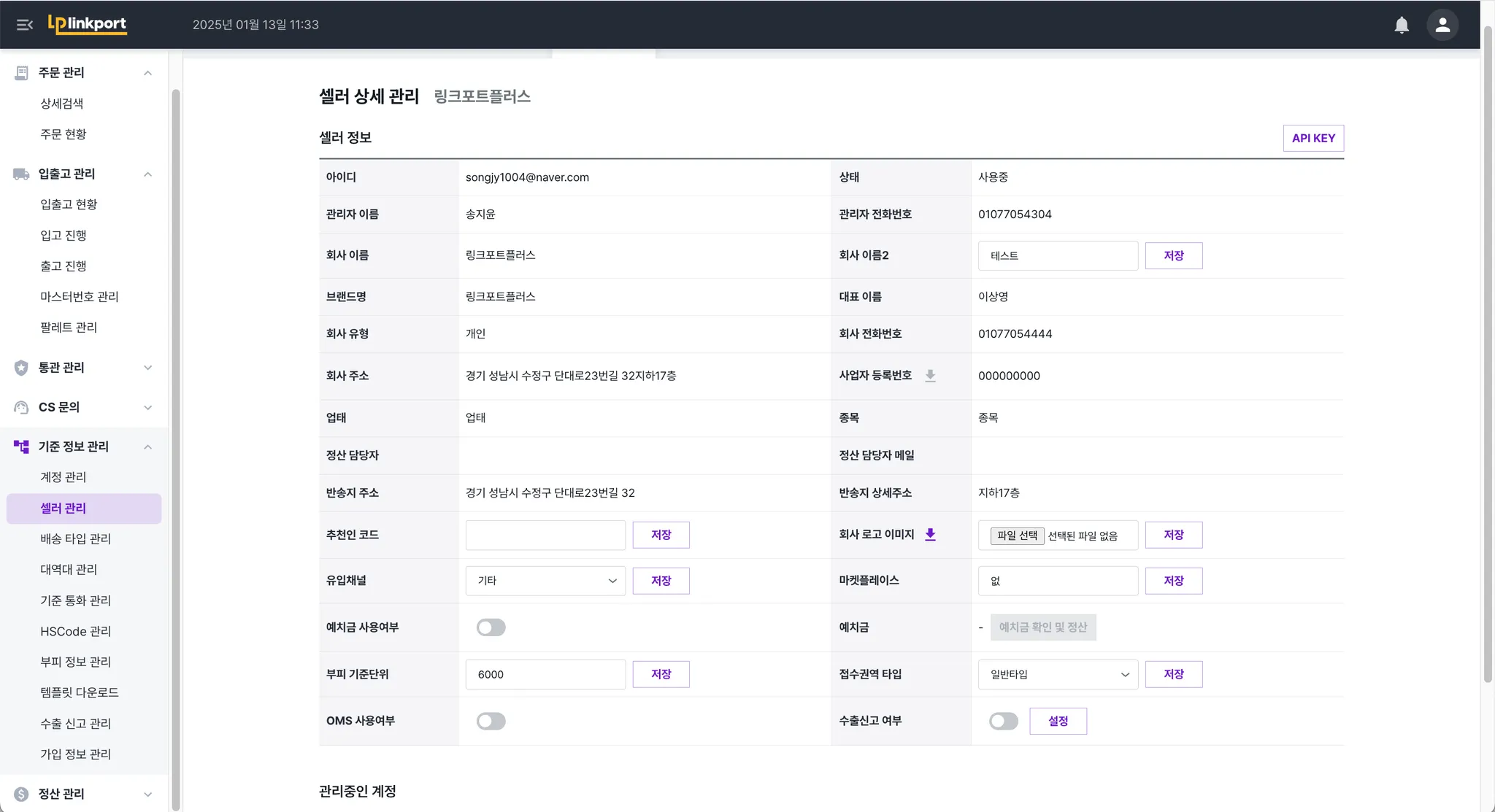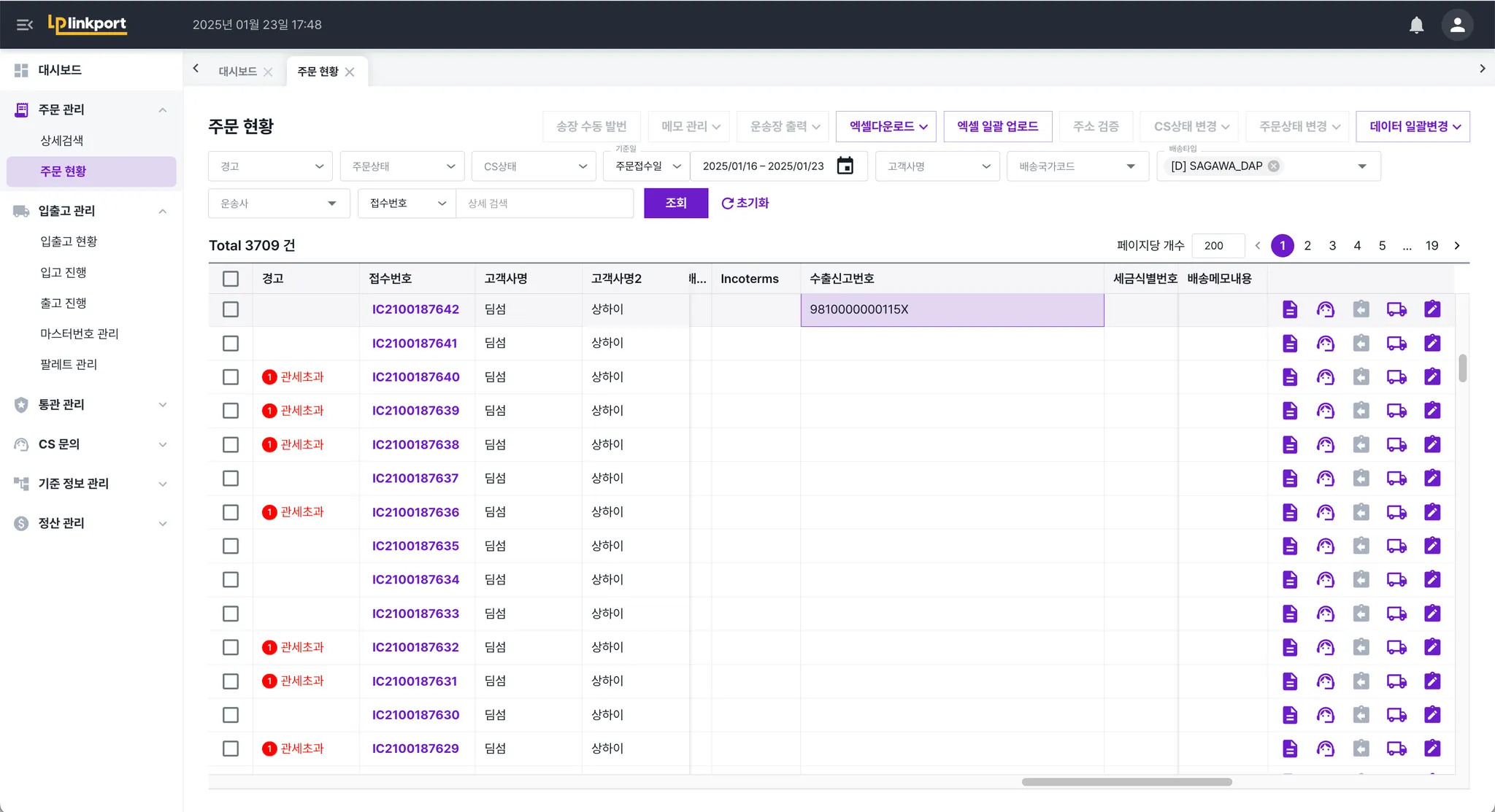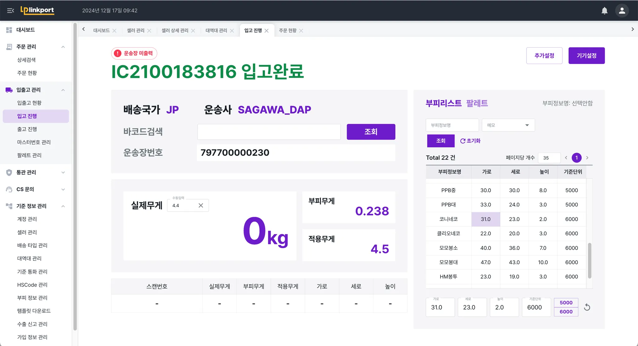 2)주문상태 변경 버튼으로 입고완료, 출고대기, 출고완료 로 변경하는 시점에 한진에 정보가 전송되지 않은 경우 운송사 전송 누락 경고를 띄웁니다. 이후 한진에 전송이 완료되면 경고는 사라집니다.