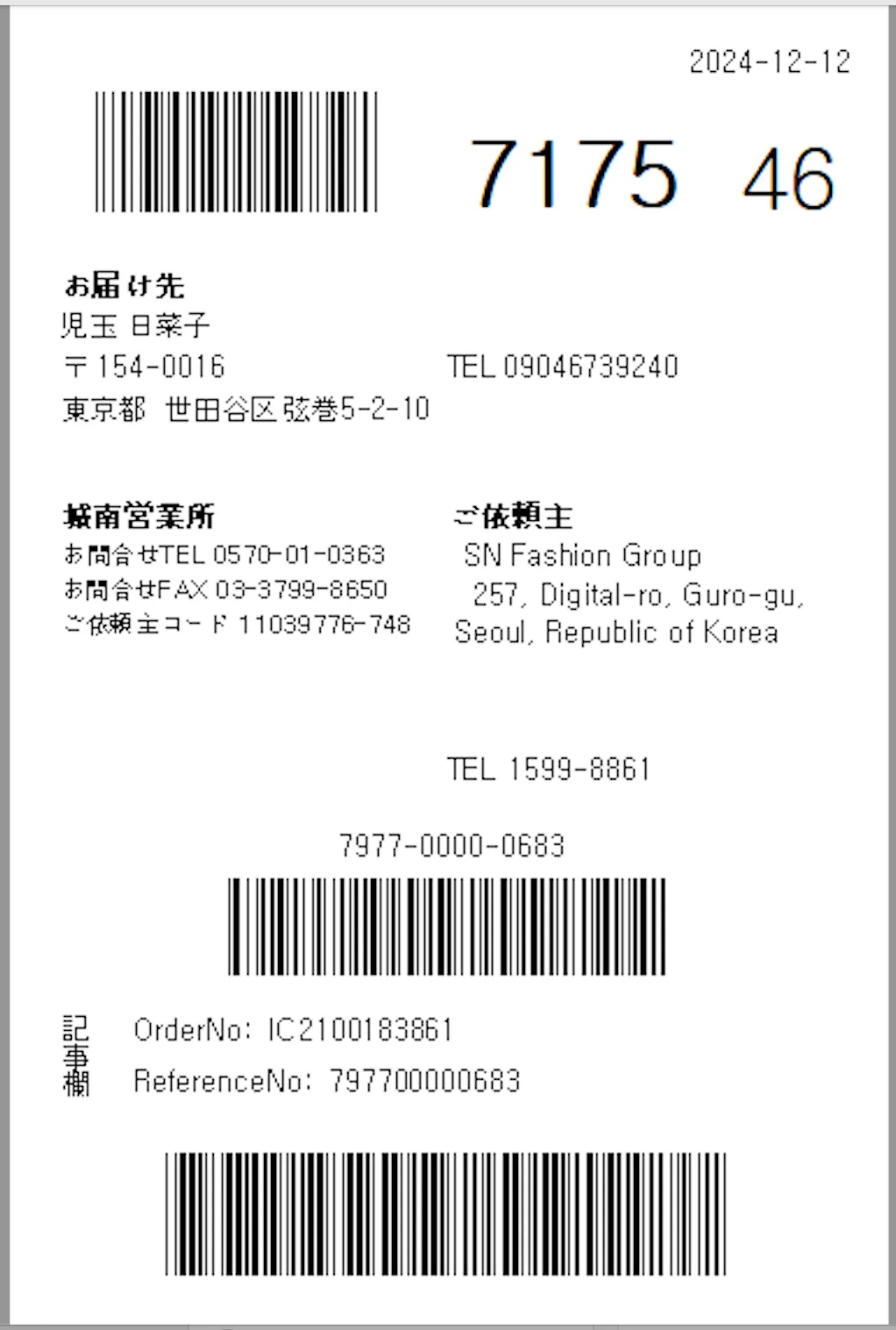 SN Fashion Group 257, Digital-ro, Guro-gu, Seoul, Republic of Korea : 발송인 정보