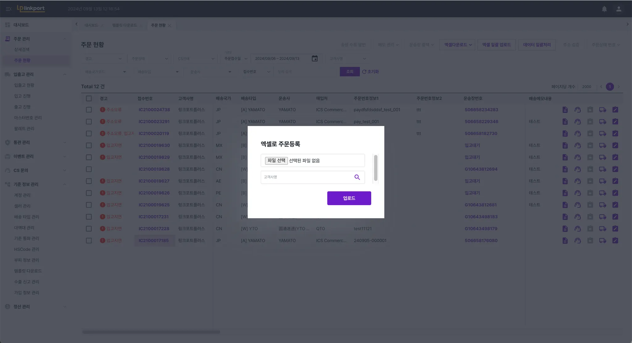 엑셀 양식 작성 후 주문현황 - 엑셀 일괄 업로드 버튼 클릭 시 첨부파일과 고객사를 선택하는 팝업이 등장합니다.