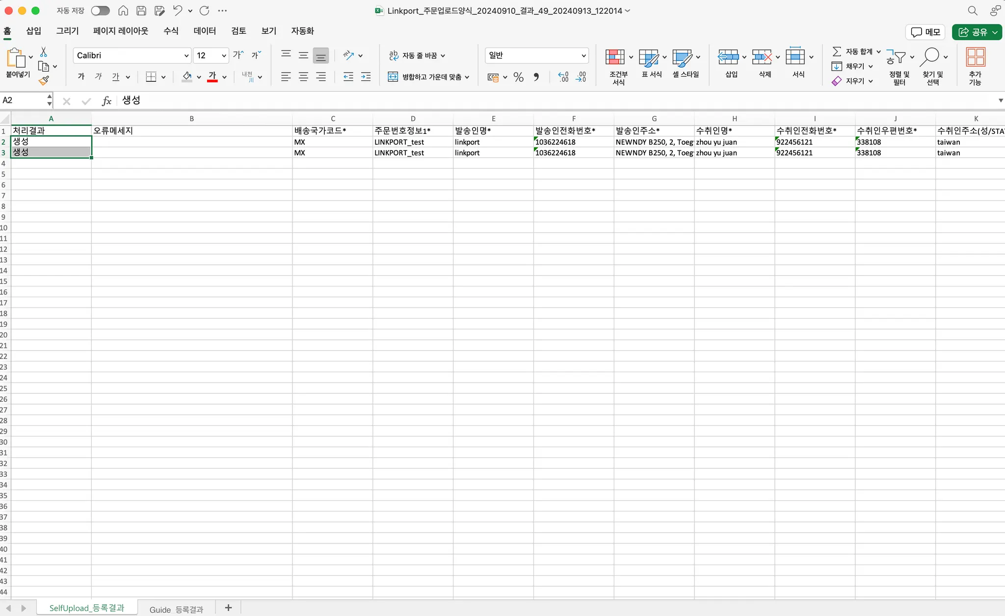이외 국가는 수취인주소2에 전부 있어도 업로드 가능
