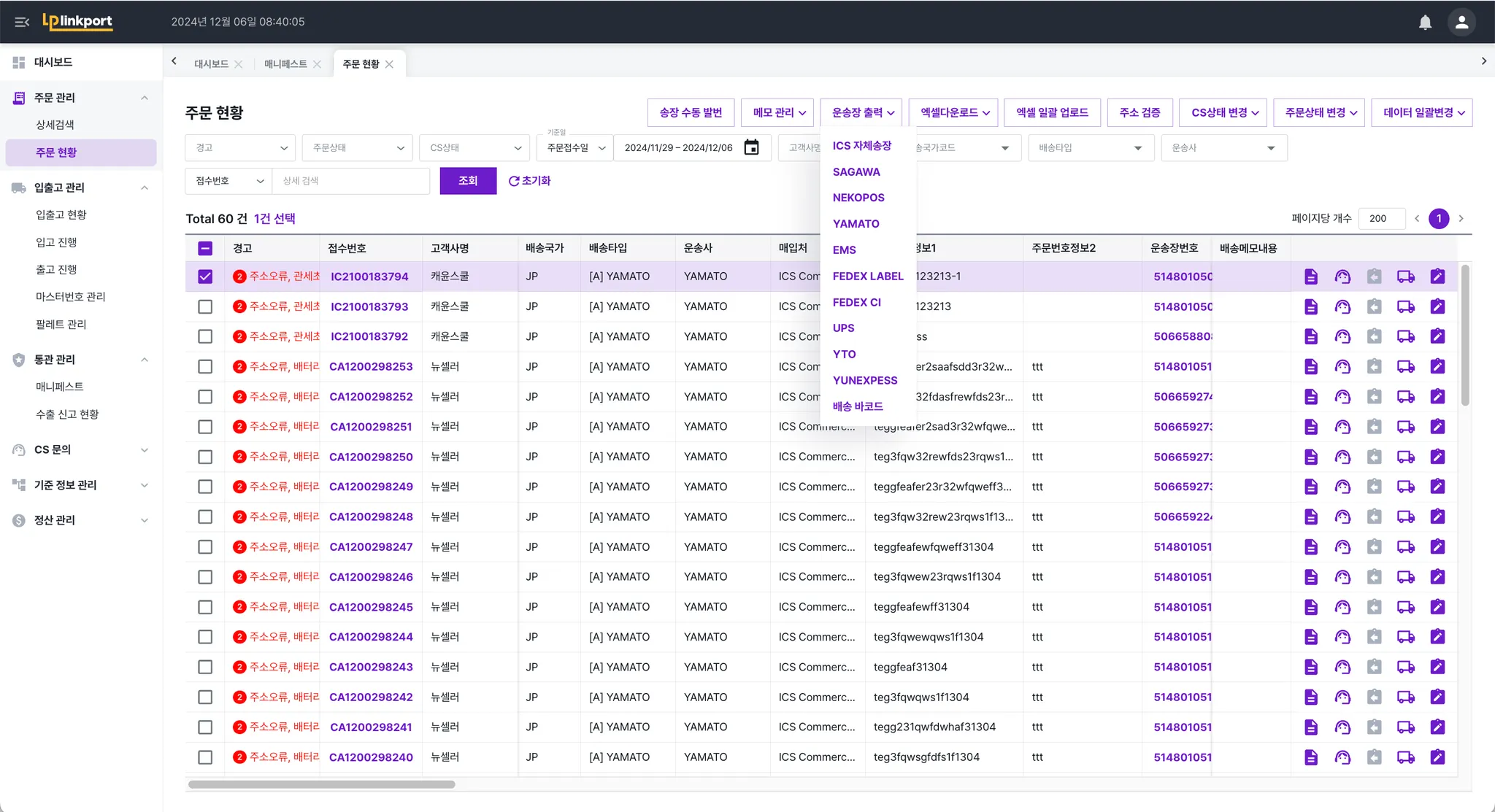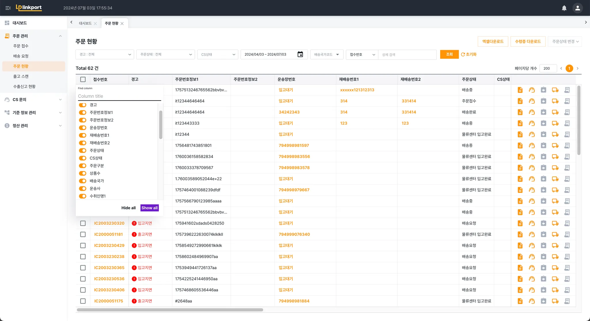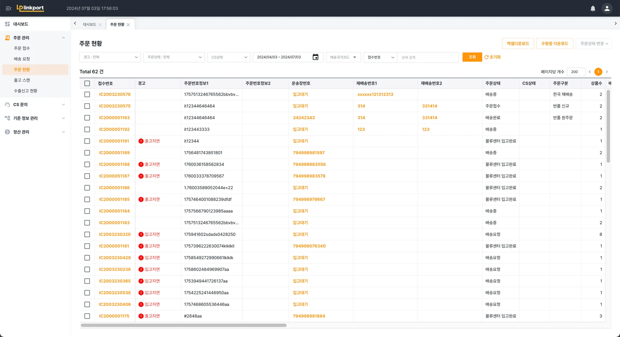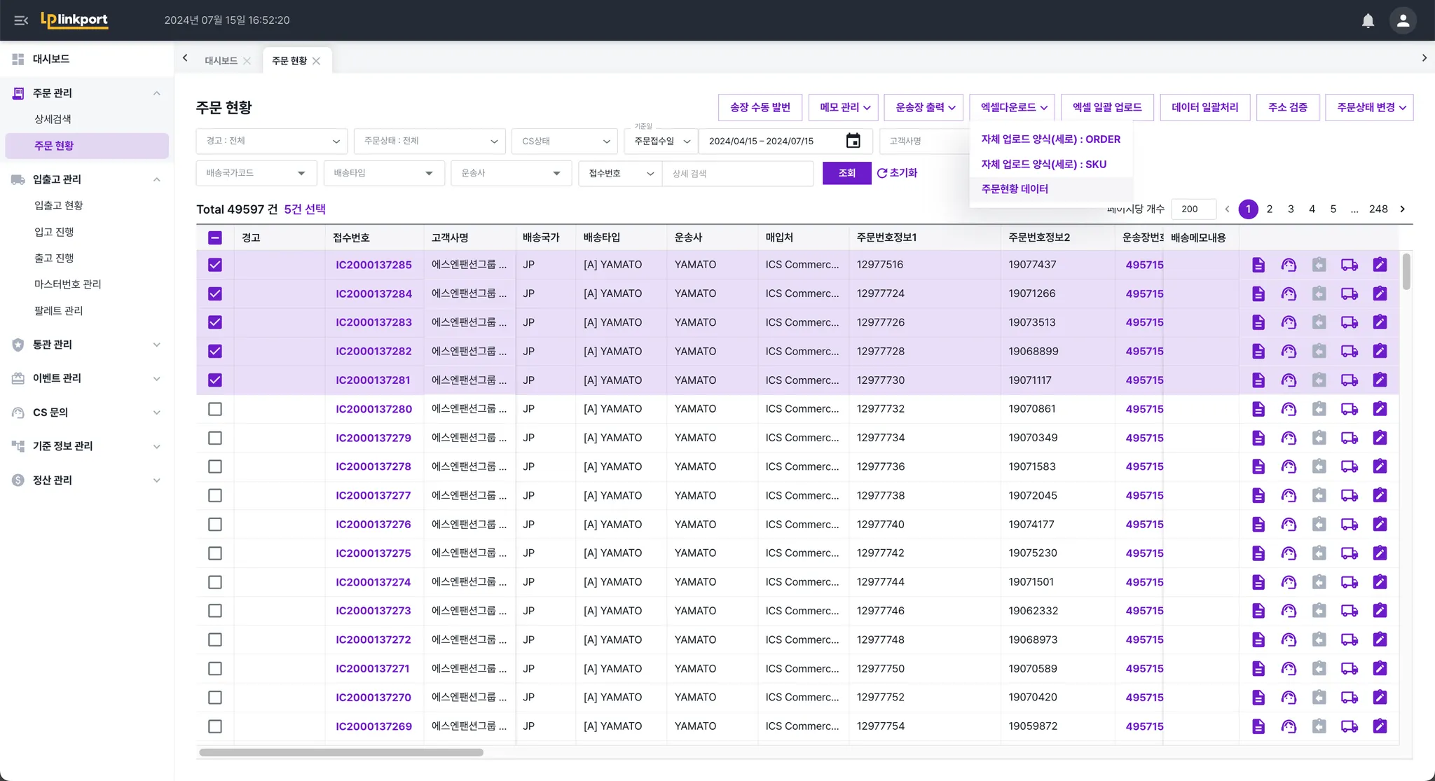 각 메뉴별 엑셀다운로드 , 운송장 출력 등 버튼이 있습니다.