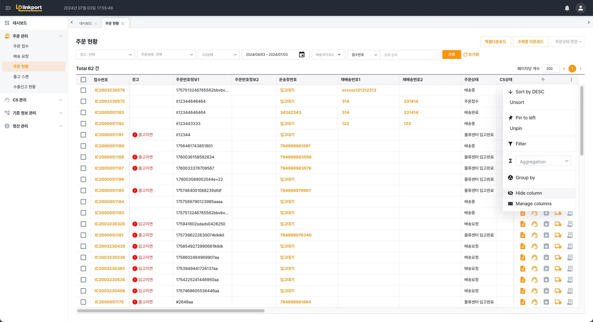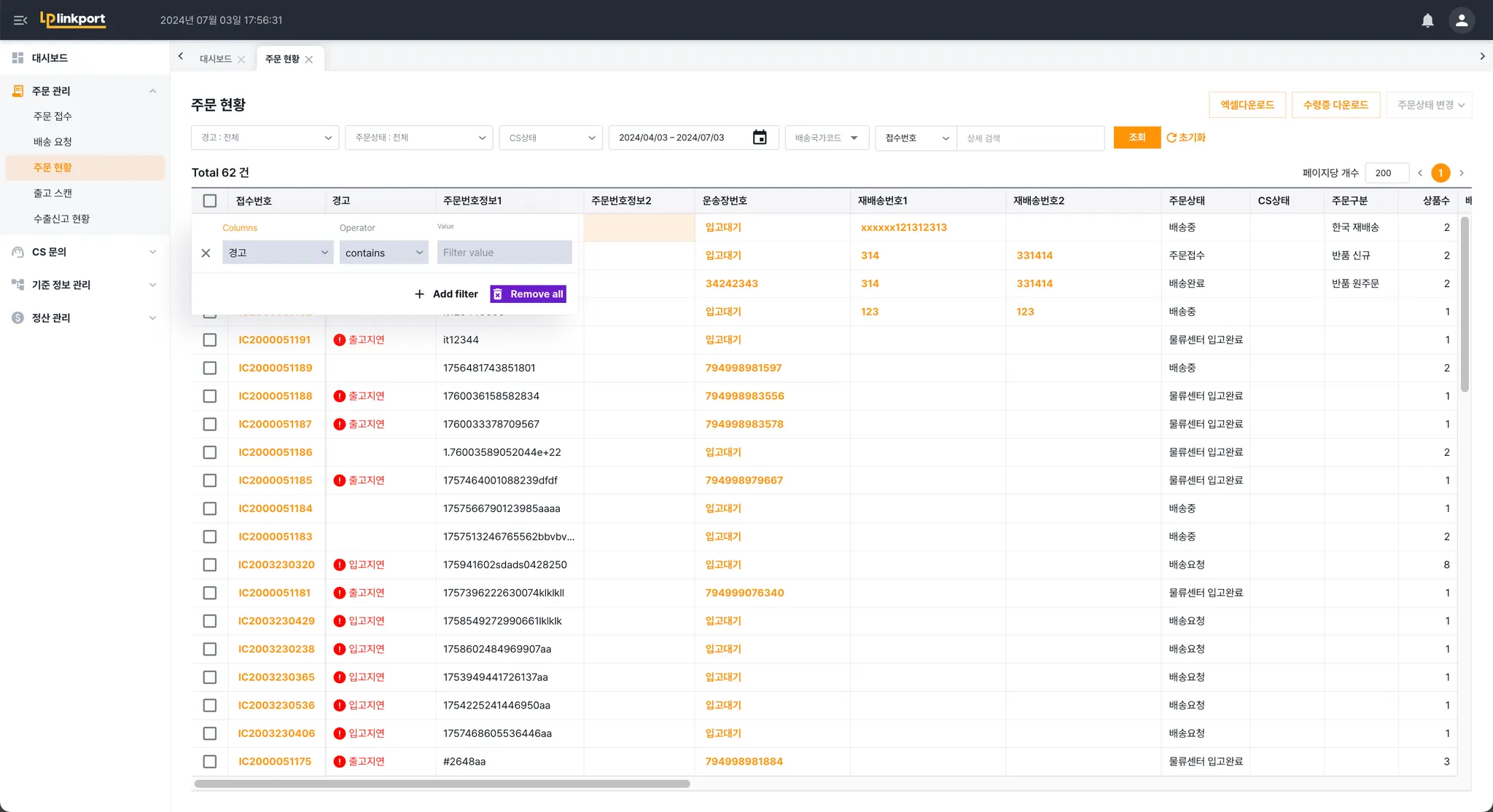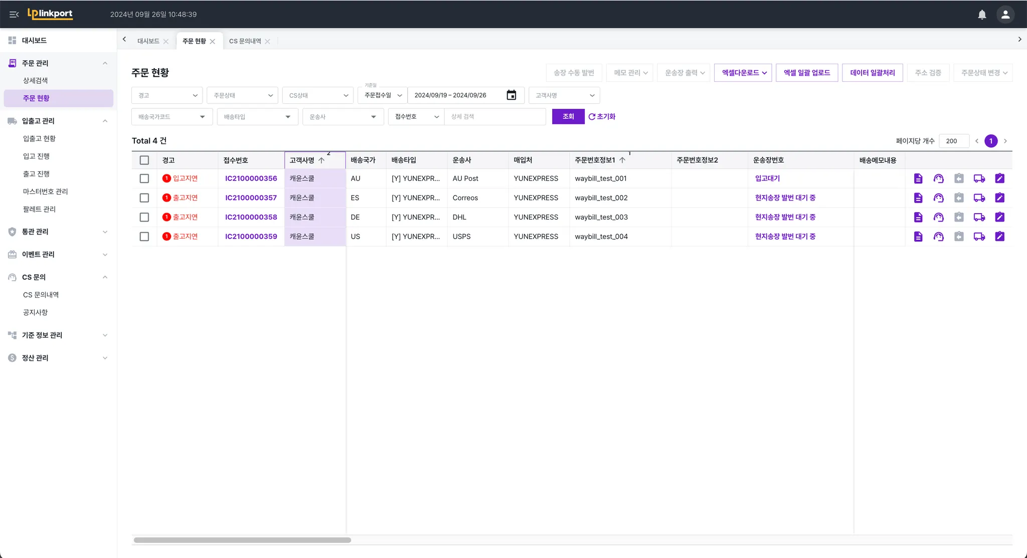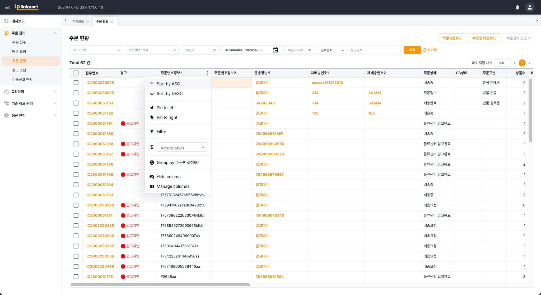 각 메뉴별 엑셀다운로드 , 운송장 출력 등 버튼이 있습니다.