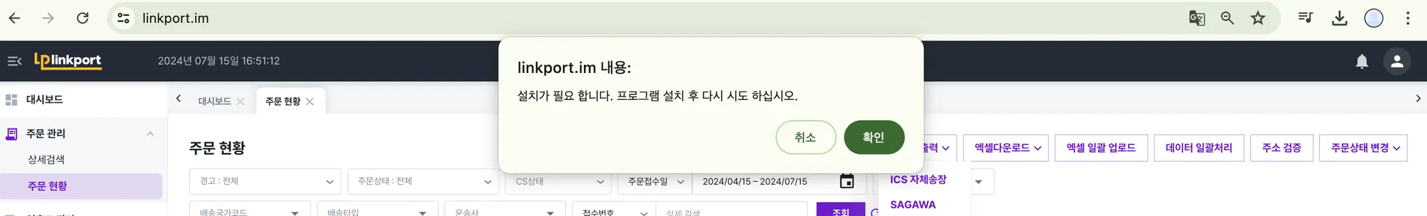 이런 경우 주문현황 - 주문선택 - 운송장출력을 통해 최초 설치를 진행합니다.