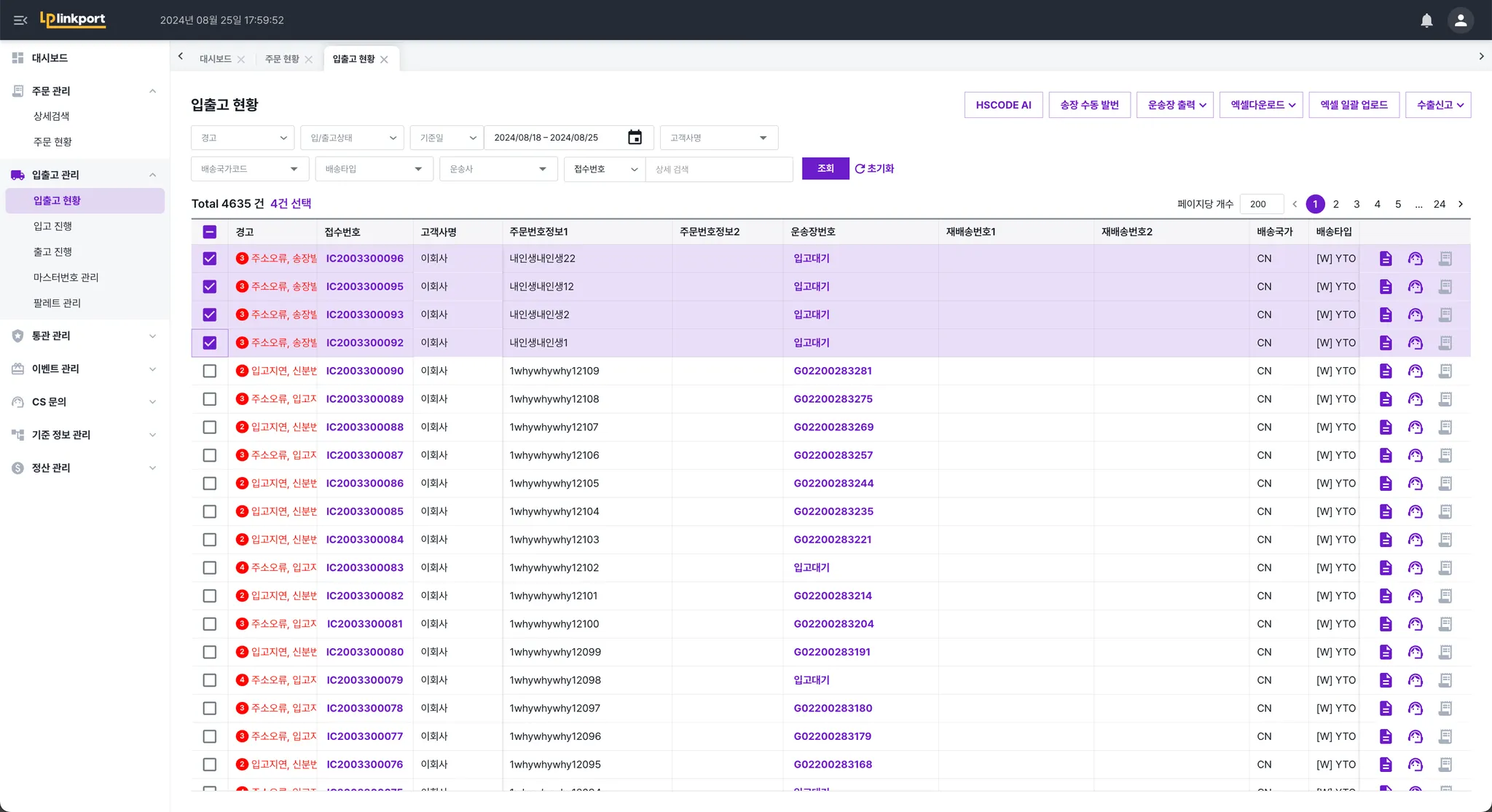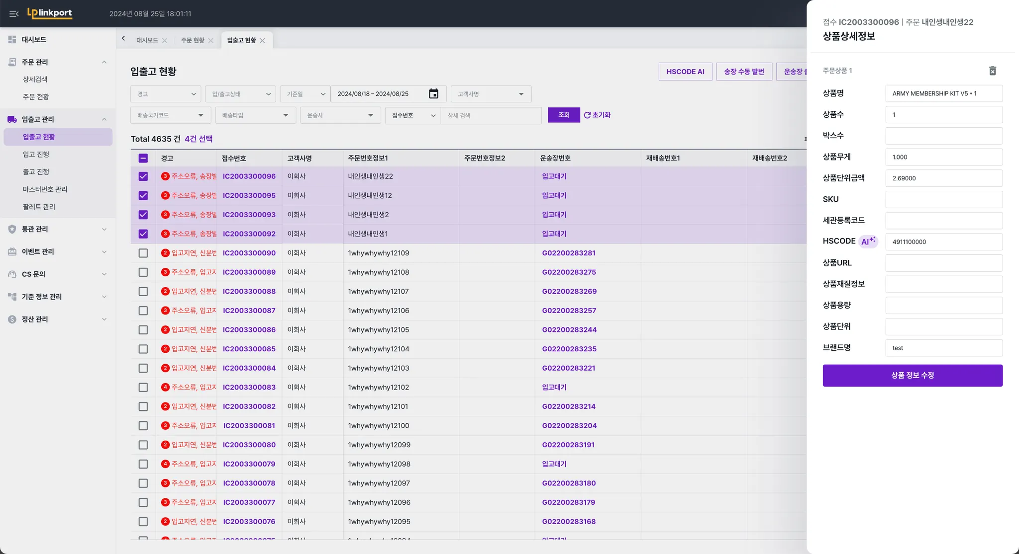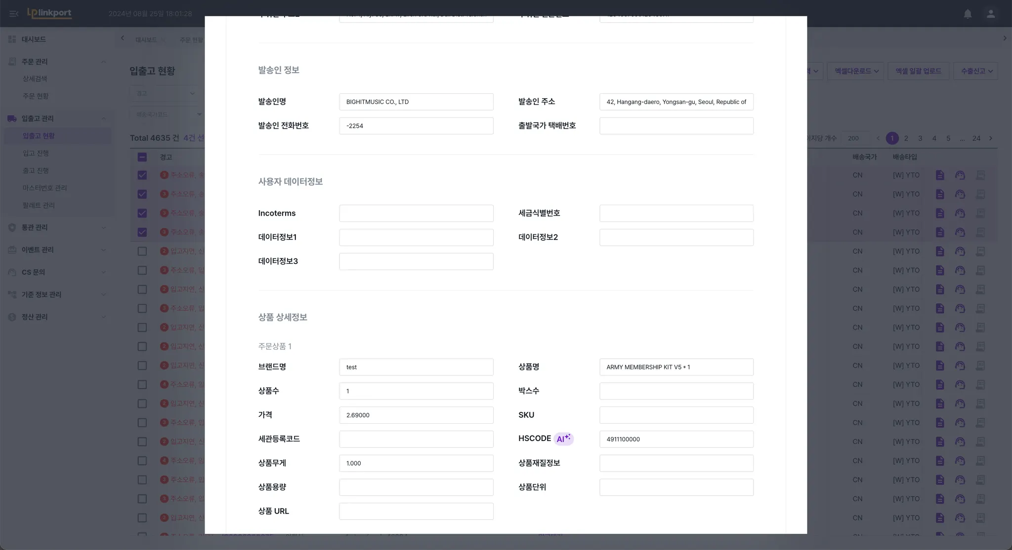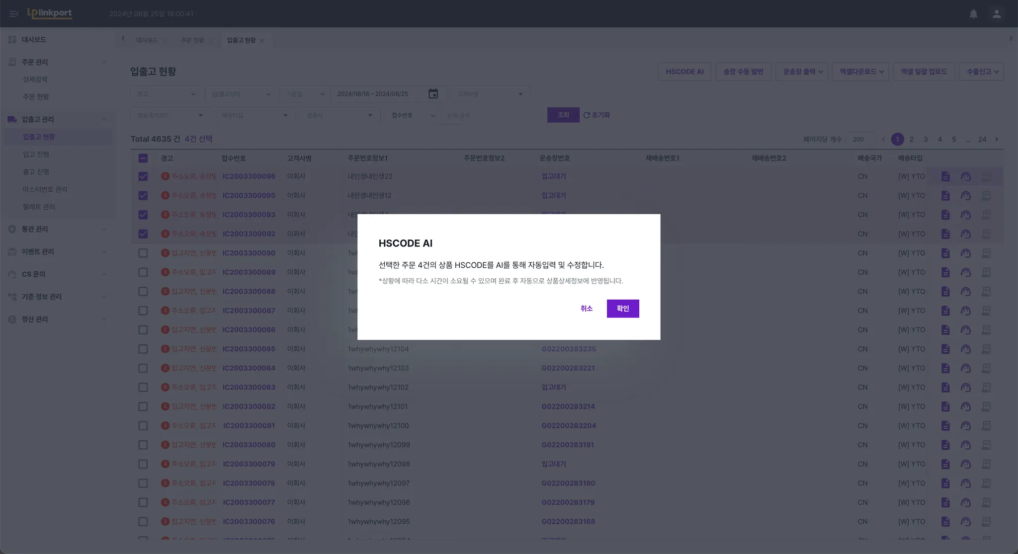 주문 선택 후 실행, AI 상황에 따라 속도 차이가 있지만 실행 후에 재조회 시 상품정보 - HSCODE 항목에 ai 뱃지와 데이터가 들어간 것을 확인할 수 있습니다.